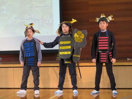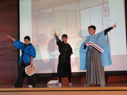 日本の歴史上の人物と出会い、大切なことに気付いていくストーリーを衣装や小道具も自分たちで作って演じました。