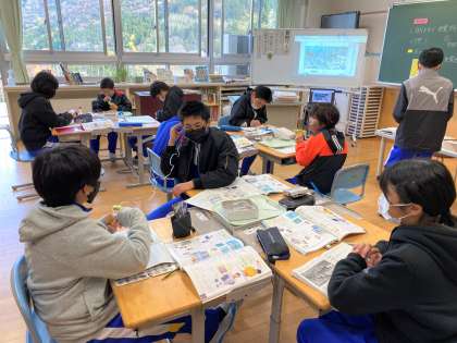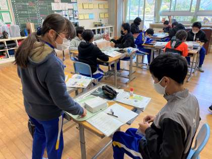 6年生は、手回し発電機を使って、電球の明かりをつけたり、スピーカーから音を出したりする実験をしていました。