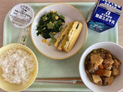 今日の献立は、ごはん、しいらの黒酢あんかけ、えごま入り卵焼き、小松菜サラダ、ラフランスヨーグルト、牛乳です。