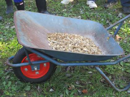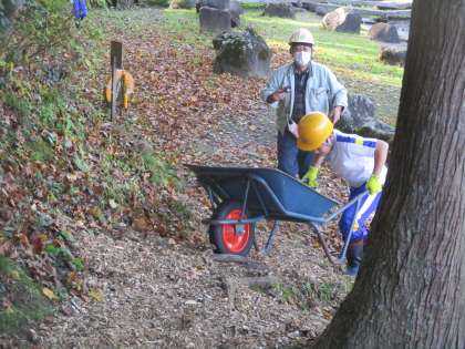 「お年寄りの方や小さい子供が、遊歩道の木の根っこにつまずいたら危ない。」と前々から話しており、今日はその問題を解決すべく、しんゆう倶楽部さんが用意してくださった木のチップを木の根っこの近辺に敷き詰めました。そうすると、木の根っこの段差がなくなり、歩きやすくなりました。これで、天湖森のお客さんが安心して利用することができそうですね。