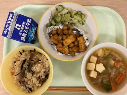 今日の献立は、ひじきごはん、いかと豆のカレー揚げ、グリーンサラダ、豆腐スープ、牛乳です。