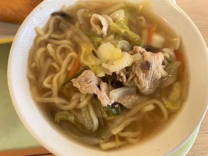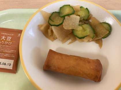 今日の献立は、ごはん、とんこつラーメン、春巻き、華風和え、大豆ふりかけ、牛乳です。とんこつラーメンには、豚肉や野菜がたっぷり入っていて、栄養バランスもばっちりそうです。春巻きに華風和えということで、今日は中華の日ですね。おいしくいただきました。