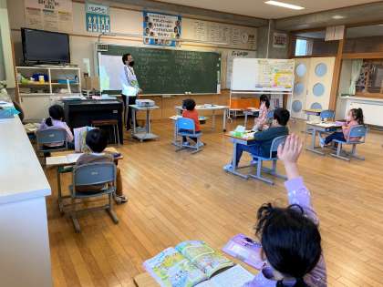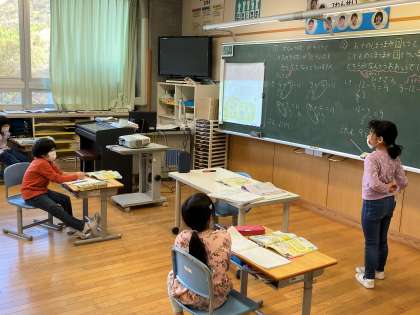 1年生は、たし算とひき算を使って文章問題に取り組んでいます。