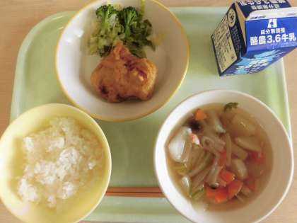 今日の献立は、ごはん、ポークパコラ、そえ野菜、かぶのスープ、牛乳です。