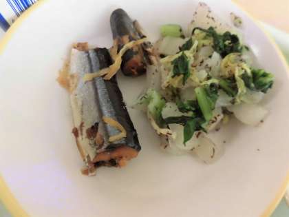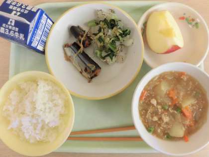 今日の献立は、ごはん、じゃがいものそぼろあん、さんまの生姜味、ゆかりあえ、りんご、牛乳です。