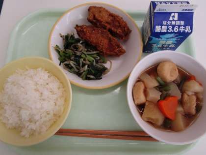 今日の献立は、ごはん、魚の利休揚げ、磯和え、関東だき、牛乳です。