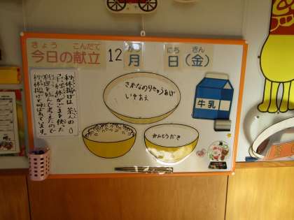 関東だきには、ベルの形のにんじんや、星の形のこんにゃくなどが入っていて、クリスマスが感じられる和食でした。調理員さんが、子供たちが喜ぶように手間をかけて作ってくださっています。小規模校ならではの細やかな心遣いに、お腹も満足ですが、心も満たされます。