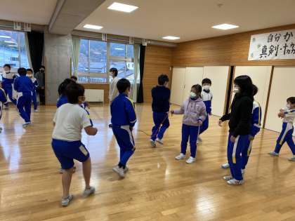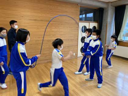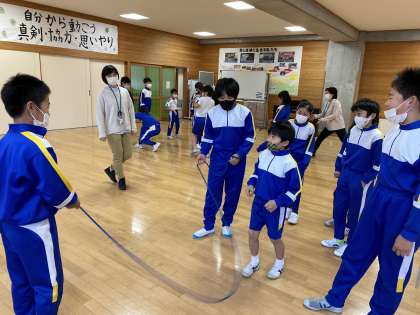 高学年がリーダーになってまだ跳べない低学年に優しく教えてあげています。