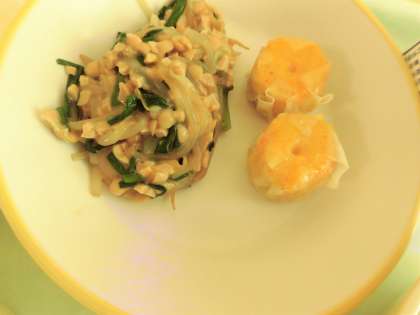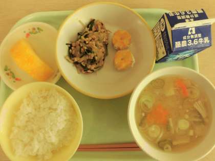 今日の献立は、ごはん、にんじんシューマイ、スタミナ納豆、具だくさん汁、カットパイン、牛乳です。