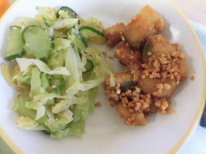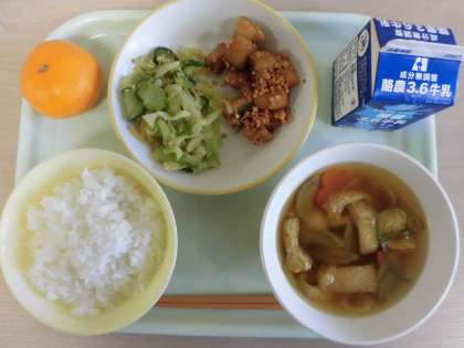 今日の献立は、ごはん、魚と大豆のゆずソースがらめ、あわせあえ、冬至の団子汁、みかん、牛乳です。