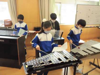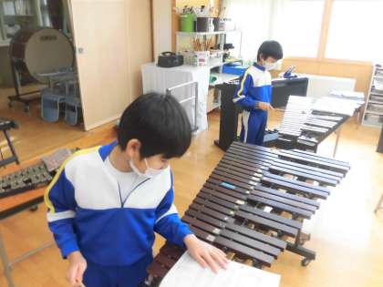 今日は活動が始まったところなので、木琴や鉄琴、打楽器などいろいろなパートを全員が試しています。