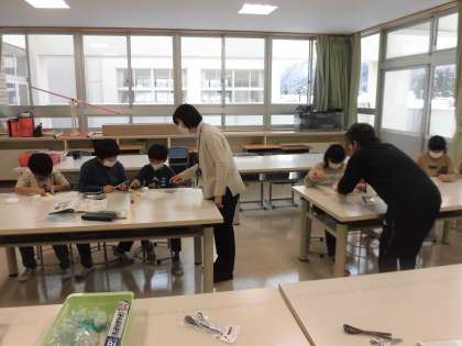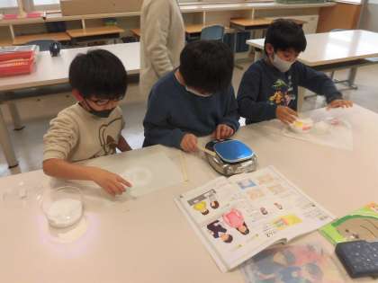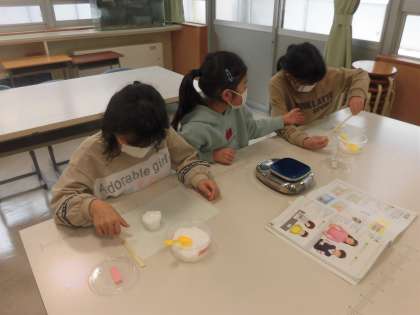 3年は、同じ体積の食塩と砂糖をはかりとり、重さが違うか確かめていました。