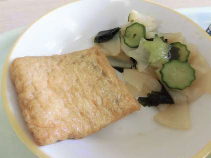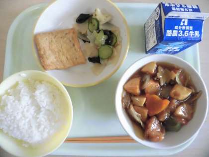 今日の献立は、ごはん、酢豚、信田巻き、わかめサラダ、牛乳です。