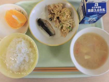 今日の献立は、ごはん、いわしの梅煮、卵とチンゲンサイの炒め物、いものこ汁、あいか、牛乳です。