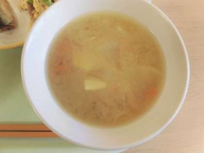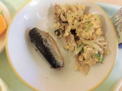 子どもの頃、里いもは苦手でしたが、年をとるにつれて食べられるようになり、今は大好物です。今日のいものこ汁に入っている里いもはやわらかくてとてもおいしいです。卵とチンゲンサイの炒め物は、本来なら主菜としてお椀に入っているメニューじゃないかと思うほどボリュームがあり美味しいです。
