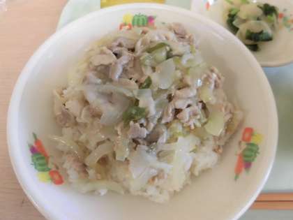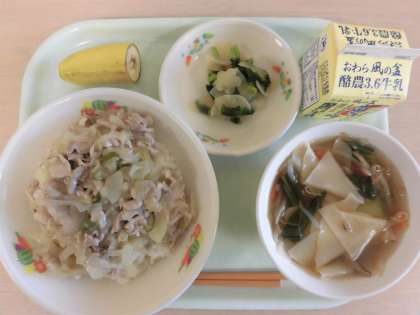 今日の献立は、麦ごはん、塩だれ豚丼、かぶの色どり、ワンタンスープ、バナナ、牛乳です。