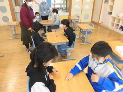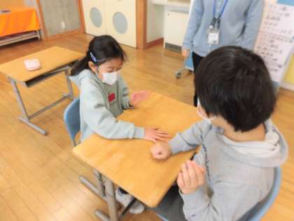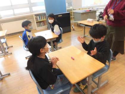 3年生の外国語活動では、ペアでゲームを楽しみながら、英語に慣れ親しんでいました。耳で英語を聞き分けて、すばやく消しゴムをとった方が勝ちです。