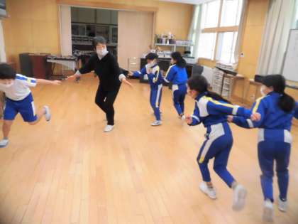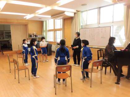 わらべ唄遊びで、体が温まった後に、「手をつなごう」の合唱の練習をしていました。
