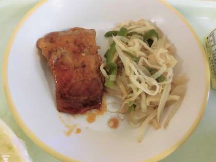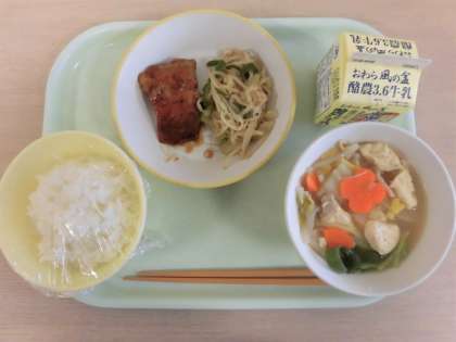 今日の献立は、ごはん、さばの照り焼き、はりはりソテー、白菜鍋、牛乳です。