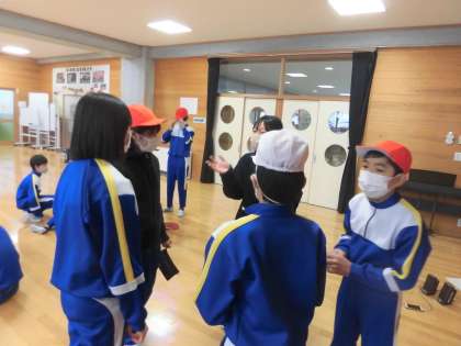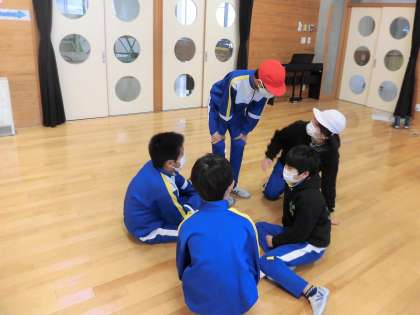 5・6年生の体育では表現運動に取り組んでいました。「激しい感じ」をイメージした表現を考えていました。火山の噴火や台風、花火など、グループで表現するものを決めています。実際に体を動かし始めているグループもありました。