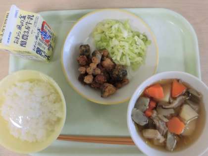 今日の献立は、ごはん、魚と豆のえごまみそからめ、ゆでキャベツ、筑前だき、牛乳です。魚と豆のえごまみそがらめは、ぶりとひよこ豆を使ってますが、えごまみその風味と油で揚げたカリッと感があります。また、筑前だきは、こんにゃくやじゃがいも、ごぼうなどが甘辛くなって食欲をそそります。