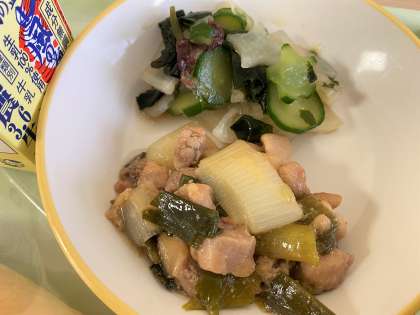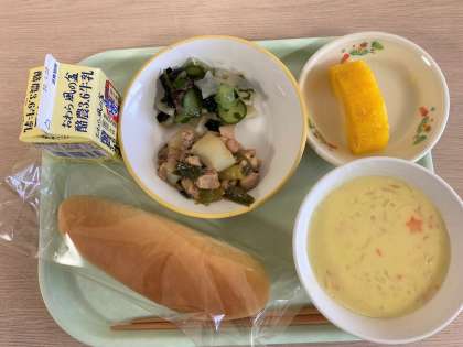今日の献立は、コッペパン、あっさりチキン、海藻サラダ、野菜ポタージュ、カットパイン、牛乳です。