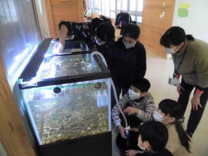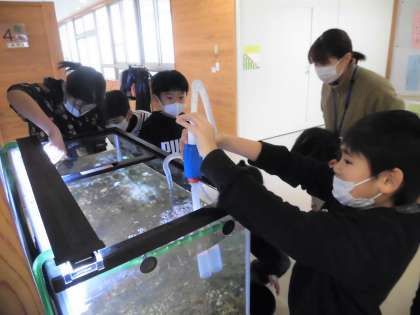 今日4年生みんなで水みらいプロジェクトで飼育している川魚の水槽の掃除を行いました。