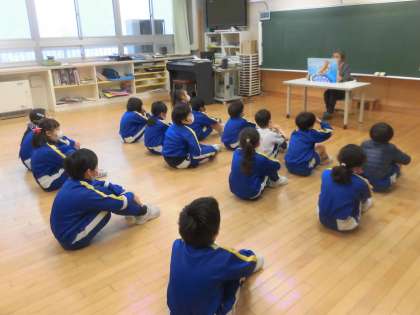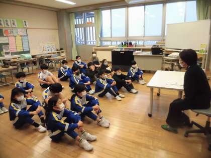 1・2年生は「さるとかめ(紙芝居)」3・4年生は「琴三味線(とやまの民話)」5・6年生は「ラプンツェル(グリム童話)」をそれぞれ聞きました。