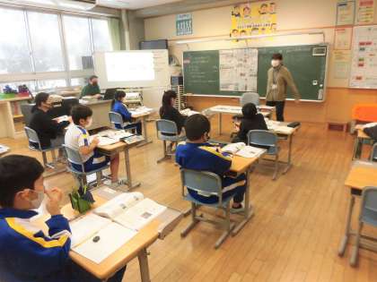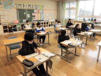 1平方メートルの新聞紙が黒板に貼ってあります。その大きさをみながら、1平方メートルは、何平方センチメートルか考えていました。