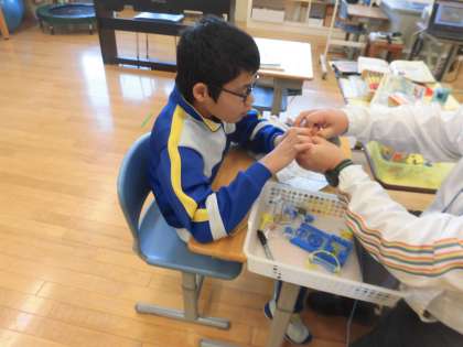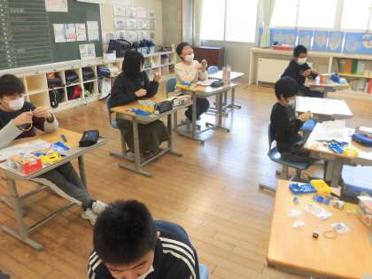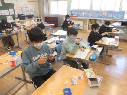 5年生の理科では電磁石のはたらきを調べるために、コイルやそのほかの実験道具の準備をしています。導線を巻いてコイルを作る作業は根気とていねいさが必要でたいへんです。