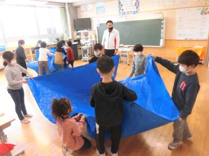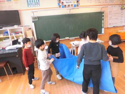 広さを比べるにはどうしたらよいでしょうか。2枚のブルーシートを広げて、広さを比べています。活動が終わった後は自分たちで協力して片付けていました。