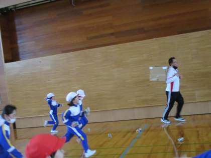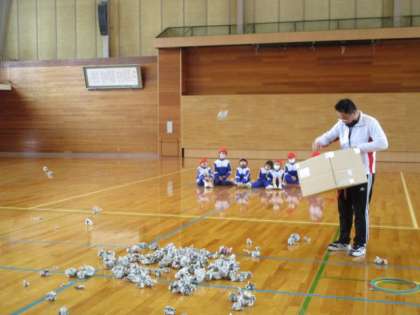 明日は、節分の日。1・2年生は特別に体育の学習で、おにの的あてボール投げやボールけり、おにごっこなどを楽しみました。最後は、豆に見立てた新聞紙玉をかごに入れようと、かごを背負ったおに役の先生を追いかけて、たくさん走り続けることができました。
