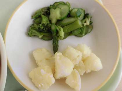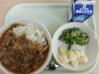今日の献立は、麦ごはん、ビーフストロガノフ、チーズポテト、グリーンサラダ、牛乳です。