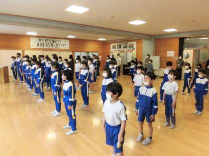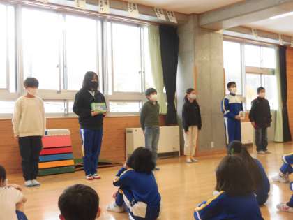 その後、県書初大会と校内なわとび大会の受賞伝達を行いました。