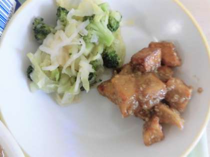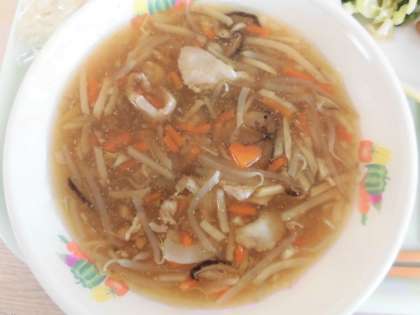 今日が今年度最後のソフト麺です。ソフト麺は、寒い冬の間の限定メニューです。今日は五目あんを書けて食べます。たけのこや干ししいたけ、もやし、キャベツなどたくさん野菜が入っていて栄養満点です。