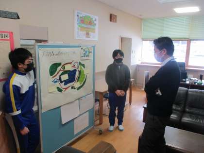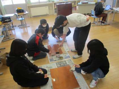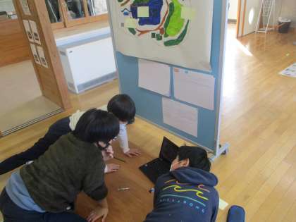 天湖森の看板をつくっています。天湖森の楽しみ方をお客さんに知ってもらえるような看板をつくっています。校長先生からもアドバイスをいただきました。
