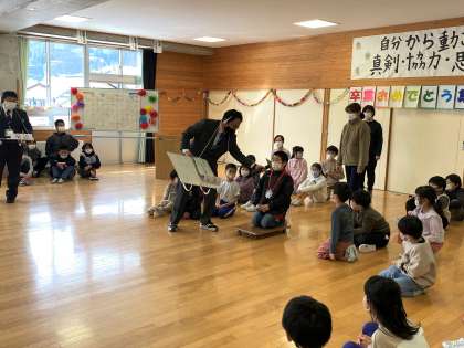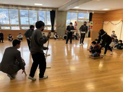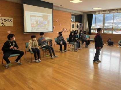 ここで突然、先生方からの出し物がありました。「ジンヅウミドリンピック2022」と題して、人間カーリング対決を先生チーム対6年生チームで行いました。カーリングのパロディ版でしたが、お約束どおり6年生チームが勝ちました。最後に先生方から「負けないで」の歌のプレゼントがありました。