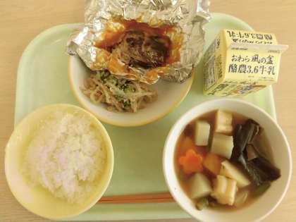 今日の献立は、ごはん、鯖の銀紙焼き、ごまびたし、関東だき、牛乳です。