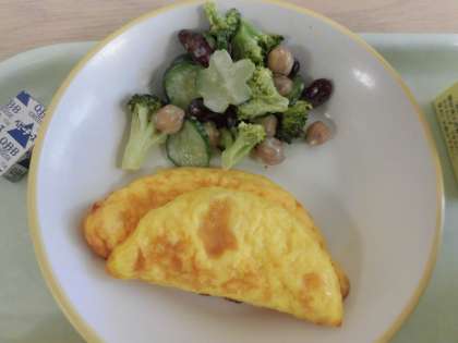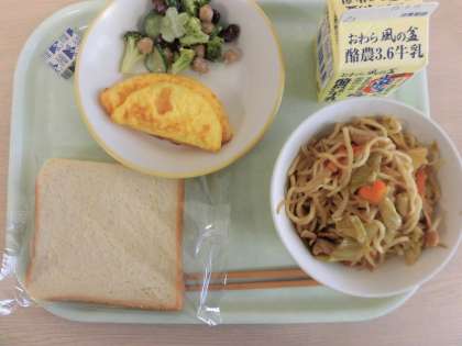 今日の献立は、食パン、焼きそば、オムレツ、ビーンズサラダ、ポケットチーズ、牛乳です。
