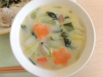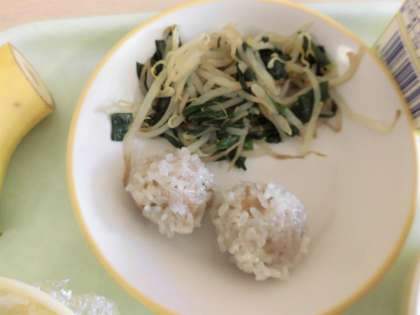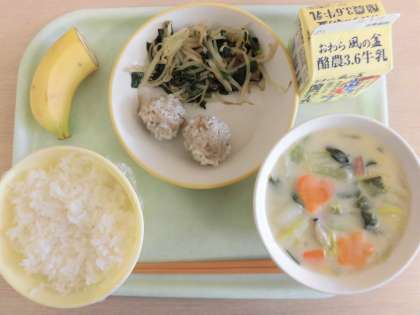 今日の献立は、ごはん、白菜の中華クリーム煮、チンズワンズ(もち米シューマイ)もやしとにらのソテー、バナナ、牛乳です。