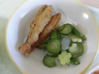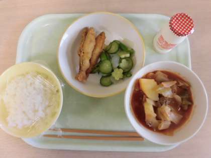 今日の献立は、ごはん、わかさぎのフリッター、こんにゃくサラダ、ボルシチ、飲むヨーグルトです。ボルシチには、牛肉や玉ねぎ、じゃがいも、キャベツがたっぷり入っていて、食べると体が温まります。わかさぎのフリッターは、かりかりで食感をとてもよいです。6年生にとっては、小学校で食べる最後の給食となります。