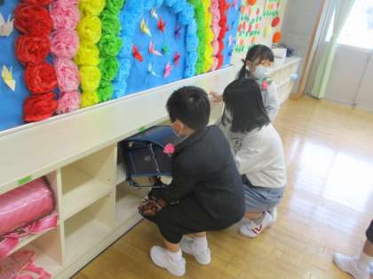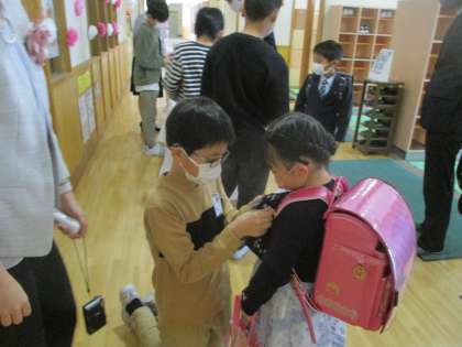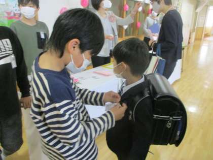 受付で6年生に名札を付けてもらい、教室へ入ります。