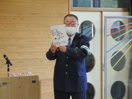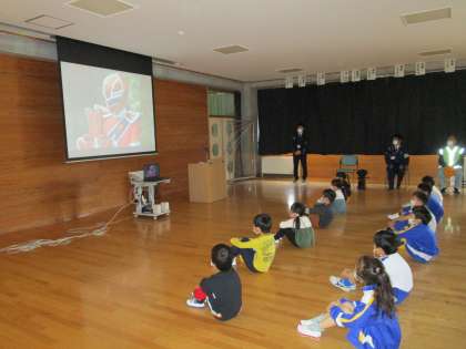 対面式に引き続き、1・2年生の交通安全教室が行われました。まず、交通安全啓発VTRを視聴しました。VTRでは、「道路の歩き方」「飛び出し注意」「横断歩道の歩き方」の3つについて学びました。