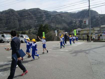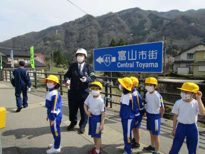 次に、実際に街頭に出て、駐在員さんから安全な道路の歩き方や横断歩道の渡り方について指導していただきました。