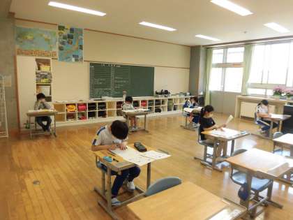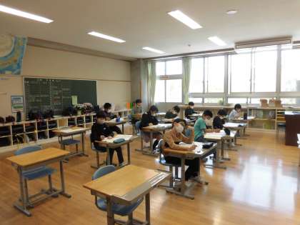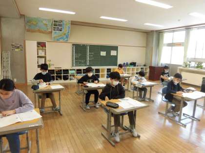 学力調査に取り組んでいます。どの学年も算数の問題に取り組んでいました。