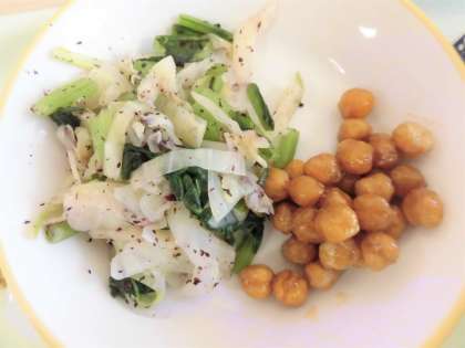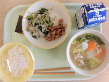 今日の献立は、ごはん、ひよこ豆のフライビーンズ、ゆかりあえ、豚汁、のり佃煮、牛乳です。