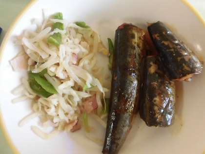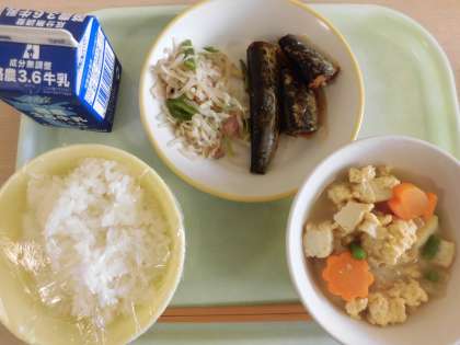 今日の献立は、ごはん、いわしの梅煮、はりはりソテー、厚揚げの錦とじ、牛乳です。