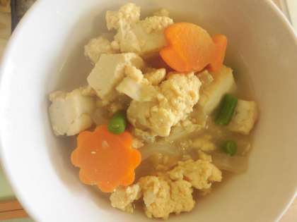 はりはりソテーには、切り干し大根が入っています。シャキシャキ噛み応えがよいです。厚揚げの錦徒事には、お魚やお花の形をしたにんじんが入っていて見た目にも楽しくなります。今日もおいしくいただきました。