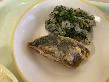 今日の献立は、ごはん、あじの竜田揚げ、よごし、五目みそ汁、牛乳です。
