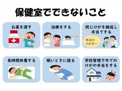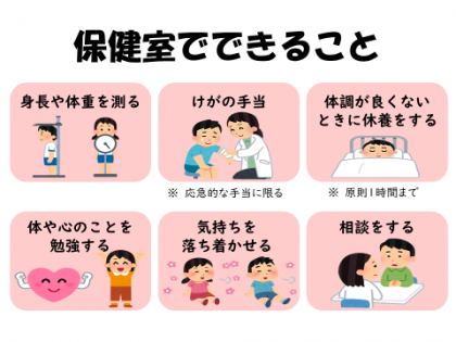 保健室については「ほけんだより4月号」でもお伝えてしていますが、HPでもご紹介します。画像をご覧ください。